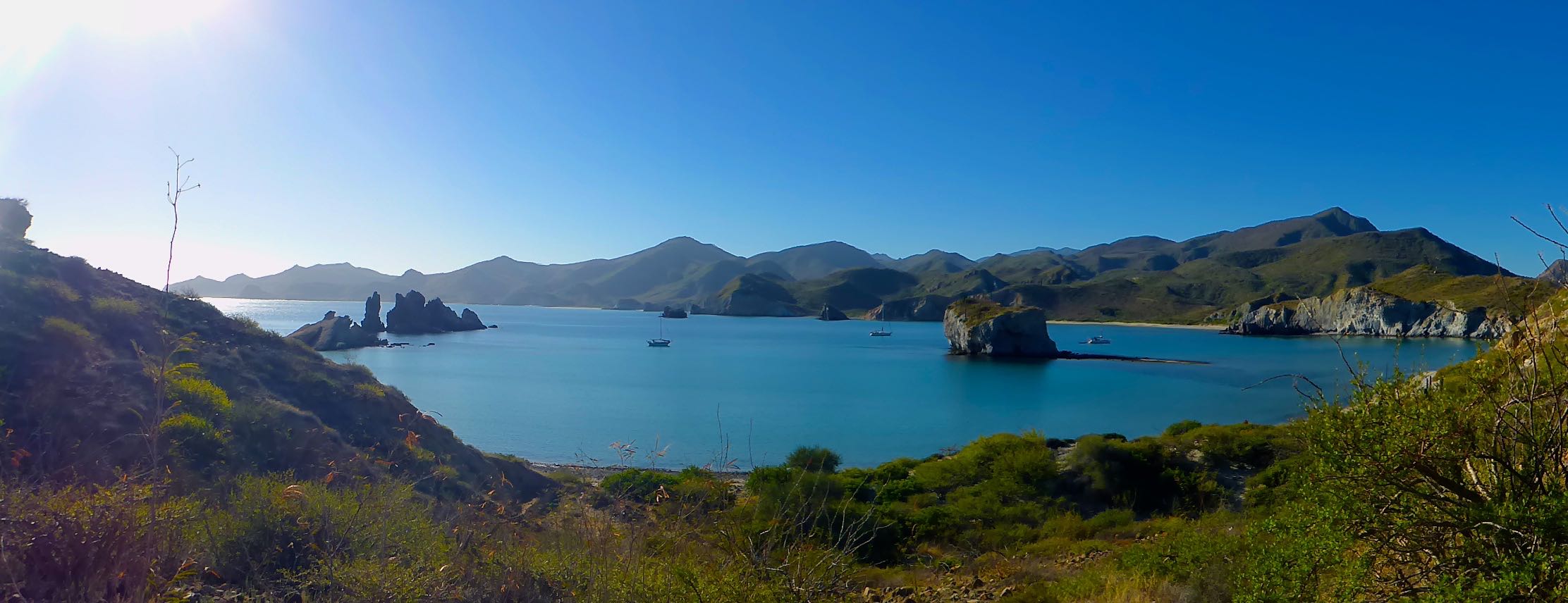 San Juanico  (Sea of Cortez) – Yes there are two San Juanico’s one on the outside of the Baja and one on the inside.  We hunkered down here to lick our wounds a bit. We went for a nice hike and met some guys from Quebec on a small sailboat called Two Step. He had purchased it recently in San Carlos and was sailing the Sea of Cortez with his girlfriend and two friends without much money or much of a plan. Pretty awesome. When we met them they were on the beach smoking the Roostertail fish they had caught as they didn’t run their fridge to save their batteries. We gave them about 15 gallons of fresh water and they happily gave us some fish. A good deal all around as Kolby hadn’t been spear fishing for a while.