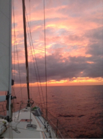 On the upside I was setting up the spinnaker today and climbed out on the pulpit to rig the tack line when I’m eye to eye with a dolphin just chilling in our bow wave. No pomp or fuss on his part, just catchinga ride as we motor along.