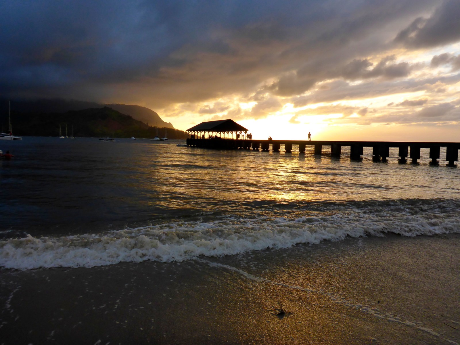 We rolled into Hanalei after our overnight passage and it was hate at first sight. This was supposed to be one of the most beautiful anchorages in the world and we hated it… The water was a murky brown, it was cloudy and rainy and a north wind was pushing in 4 foot rollers into the bay. The current frequently left us abeam to the waves and we would roll so hard it was enough to make you want to jump over board. Except you didn’t because the was was so murky you could see your feet in ankle deep water and it was cold from all the river run off. Plus it rained for like 3 days non stop. This for our last week in Hawaii!! We contemplated moving the boat to the drier side of the island but instead rented a car. Then we moved into more sheltered water, set a stern anchor and things got much better. Before we left Hanalei Bay had dried up and turned into the most beautiful bay in the world. The water was turquoise, the mountains had hundred foot water falls snaking down them and the weather was warm. Being the wet side we still had several showers each day but they were brief and the sun came out between. So glad we stayed!
