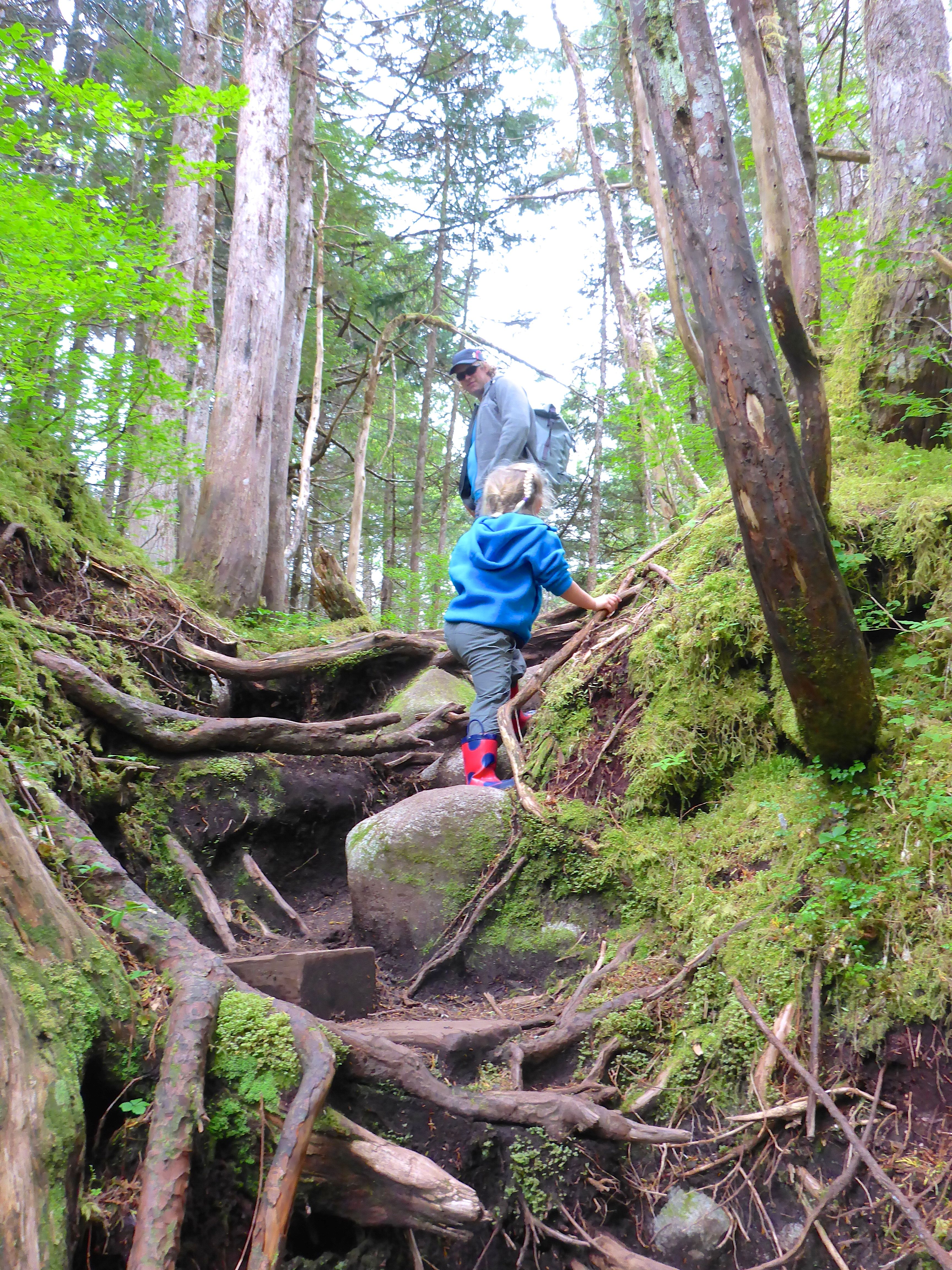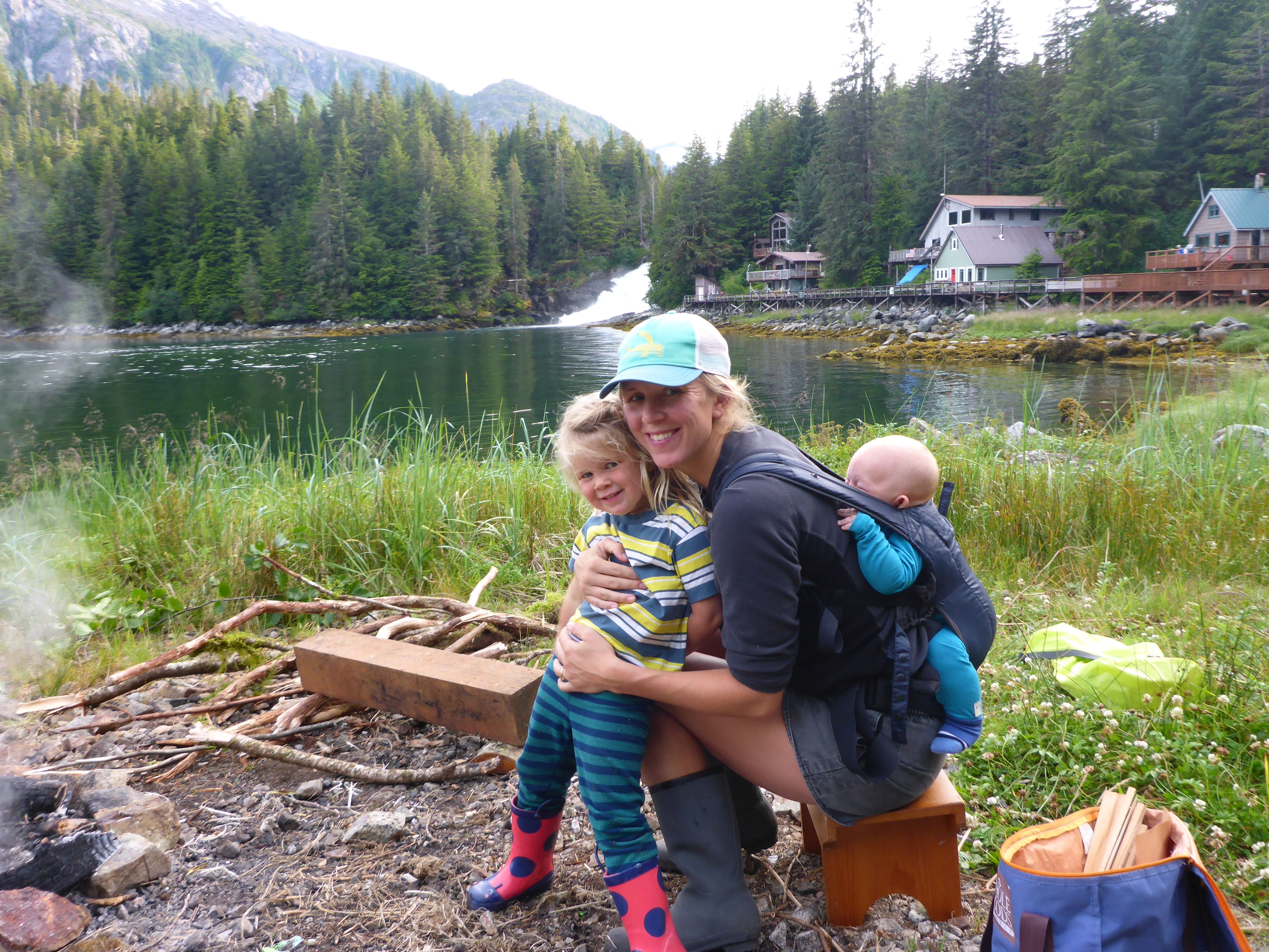 The next morning the sun was shining. It was glorious. The temperature rose quickly and was soon in the 20s. Kolby used the unlimited water hose at the dock to wash the grime of travel off Asunto. She certainly looked proud of herself after that- we didn’t have the heart to tell her she was still pretty dirty… Adding Bowen to our travels has really made it hard to keep up with the cleaning. Anyway, Fynn and Bowen and I walked the boardwalk, devouring salmon berries. We even found some the size of golfballs! That afternoon we hiked to the lake were we met a nice family from Sitka. Fynn was so happy to play with the boys.