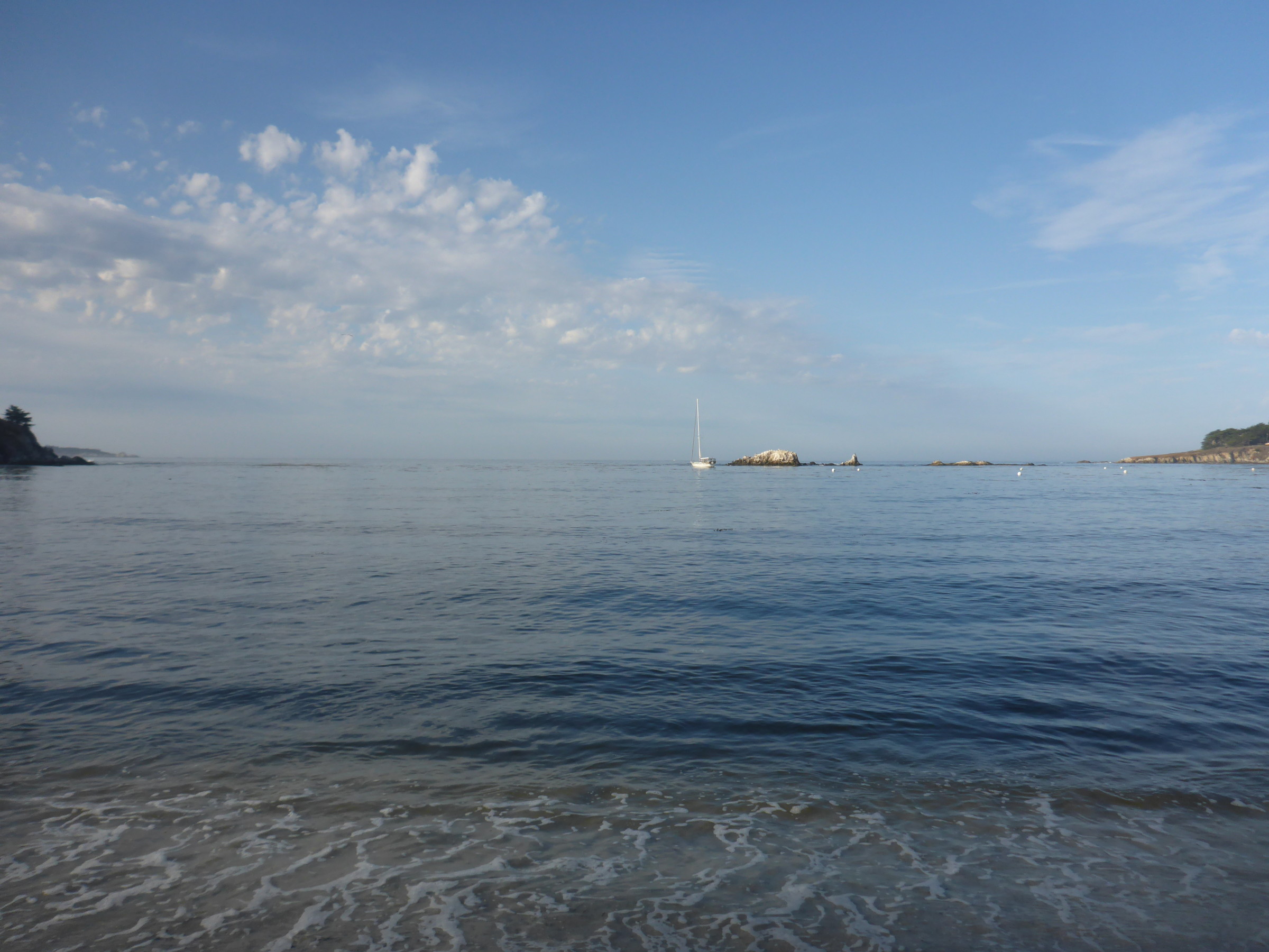 Not so still. I guess it gets this name from the calm waters of the summer. We continued to have swell after swell. Fynn is now a pro at balancing with the rocking and timing her movements with the calm. Kyber is less than pleased. We tucked Asunto in behind Pescardo Rocks just as the sun was setting. The bay is getting choked with winter kelp already but we found a hole and stuck well. Lining the shore is a world class gold course and the Pebble Beach Yacht Club and Resort. The Yacht club has a dinghy dock and the moorings in the bay are privately owned. Unfortunately the dinghy dock is raised during the winter (after Labor Day) so it was another beach landing for us. Although scattered with marine debris, the sand was luxuriously soft between my toes. Kolby went off for a dive in the afternoon, which was momentarily suspended when his BCD and tank rig fell off the back transom and sunk to the bottom of the sea. Fortunately he found it in the murk and had a great dive, finding abalone, lingcod and other rockfish. Returning to the boat with his loot we proceeded to learn how to process an abalone (more complicated than you might think; thanks YouTube!) and feasted on abalone chowder and fresh baked bread. We had a flash thunderstorm and discussed boats being struck by lightening. Tonight will be our first overnight passage since arriving in San Francisco as we head some 80 nm to San Simeon Bay and the base of Hearst Castle.