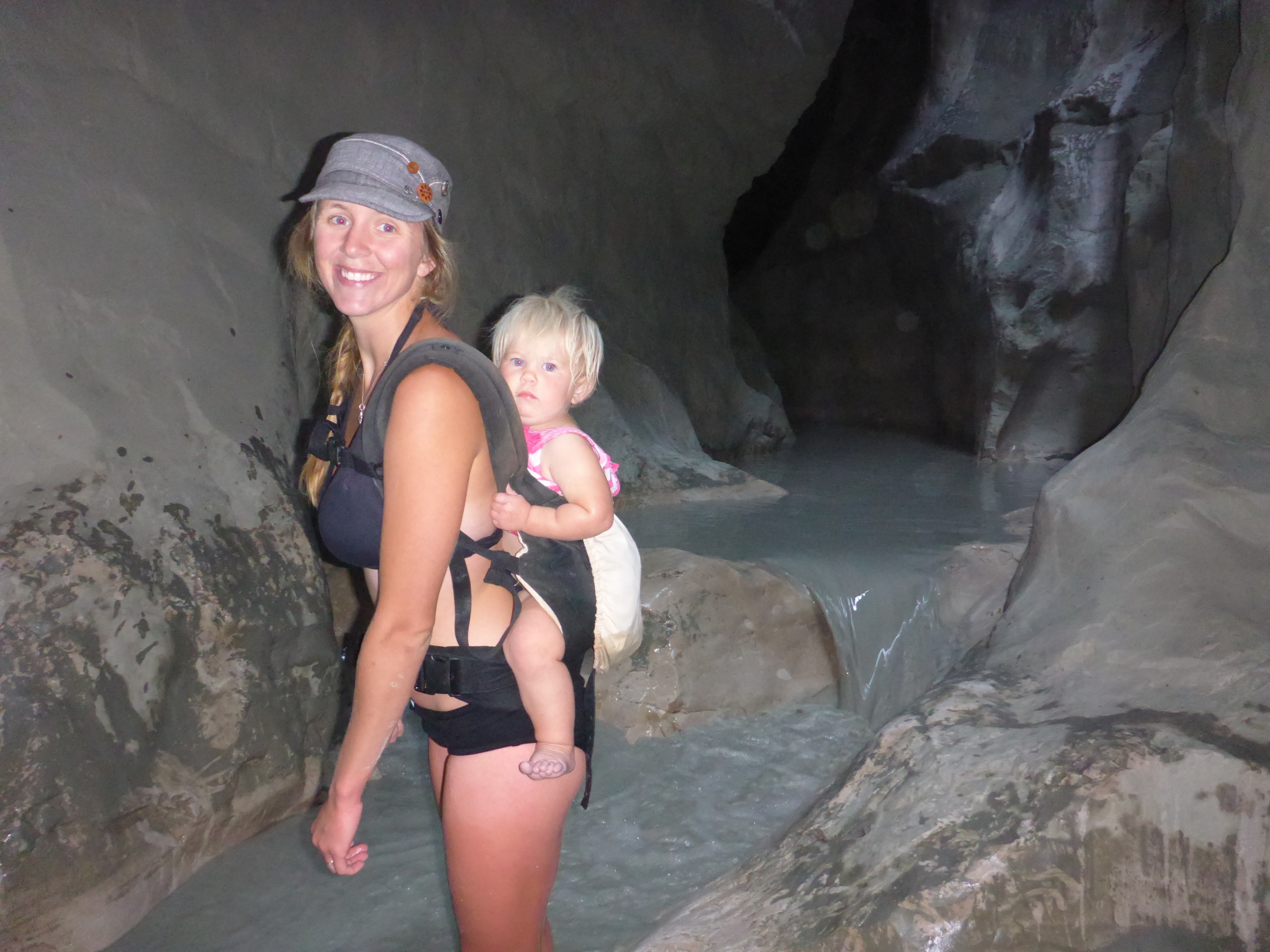 Clip #40Now for the more adventurous… Canyoning! This is basically scampering up a river bed at the bottom of a huge canyon. The water was cold and muddy but the experience was awesome! Of course we didn’t turn back where most do. Not even when the rest did. Nope we made it right to the end. The canyon was a narrow slit. Fynn was a trooper – as long as she didn’t get soaked!