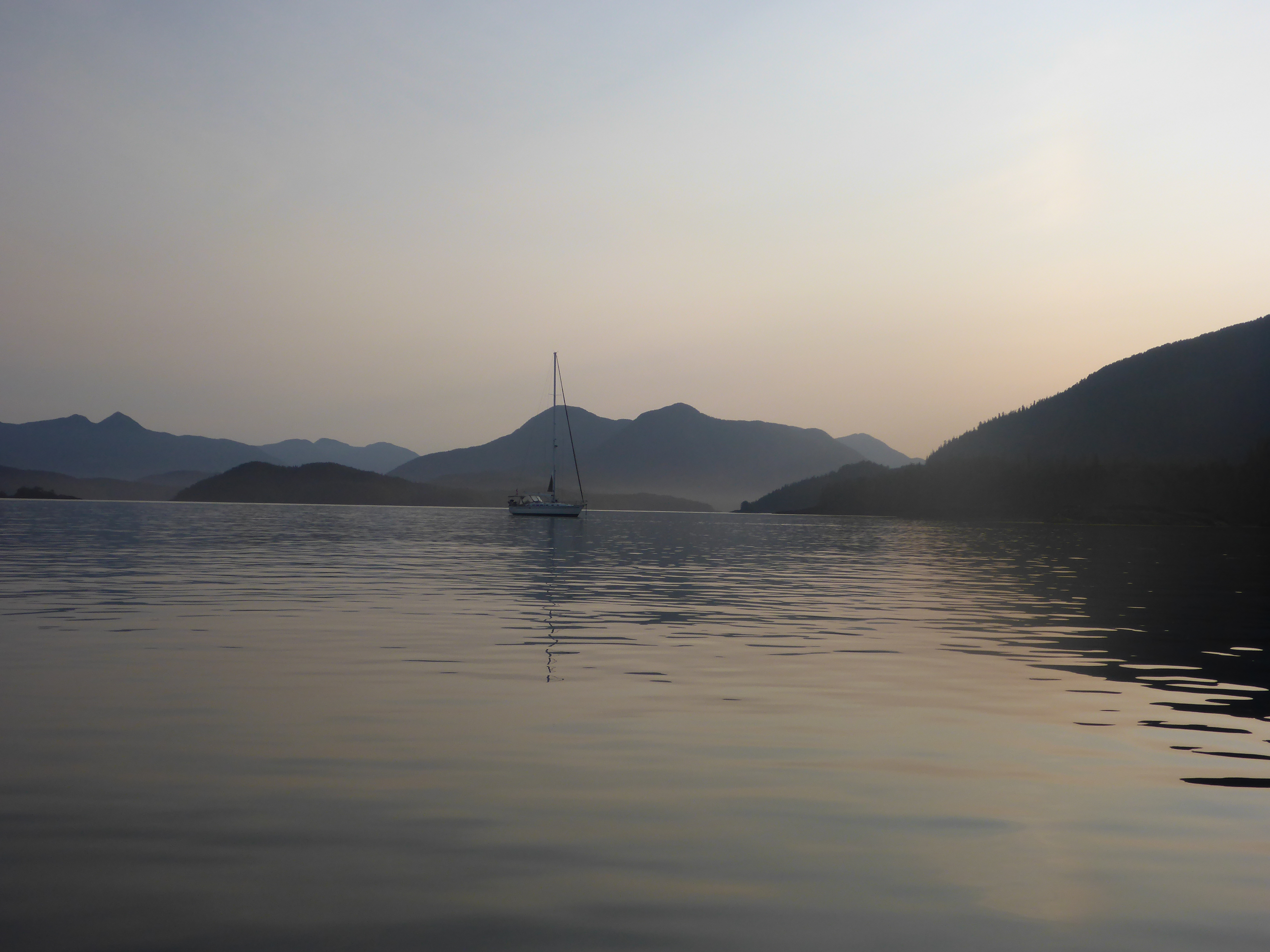 The glorious blue skies had been accosted by clouds, and evidence of the infamous fog bank was encroaching. The pull of Hot Springs Cove was getting stronger as the temperature dropped. However the luxury of the Hot Springs was not to be easily won. A strong southerly wind had picked up and we found ourselves beating into 30 knots of apparent wind. Asunto hurled herself into the wind and healed hard over, toe rail in the water. Kyber hunkered down into his bed, wedged between the table and bench in the cockpit. Fynn, however, was delighted with this change in her home as previously unreachable areas were suddenly easily climbed. Tacking back and forth we made only 5 nm headway in 3 hours. Just as we thought we would never make it, the wind abated and finally stopped altogether, forcing us to motor the remaining distance along the rocky shore of Nootka Island. Tucking into the anchorage as Hot Spring Cove a 6 pm, the sun was shining and despite our exhaustion we put Fynn into her pyjamas then into her carrier and headed off to the springs where Kolby treated me to a soak as he explored the cove with Fynn sleeping in the carrier. As we walked back along the board walk, busy looking down as the boat names and artwork, we were treated to a glorious sunset through the branches. If we had have known it would have been our last sunset for days, we may have looked up a little longer.