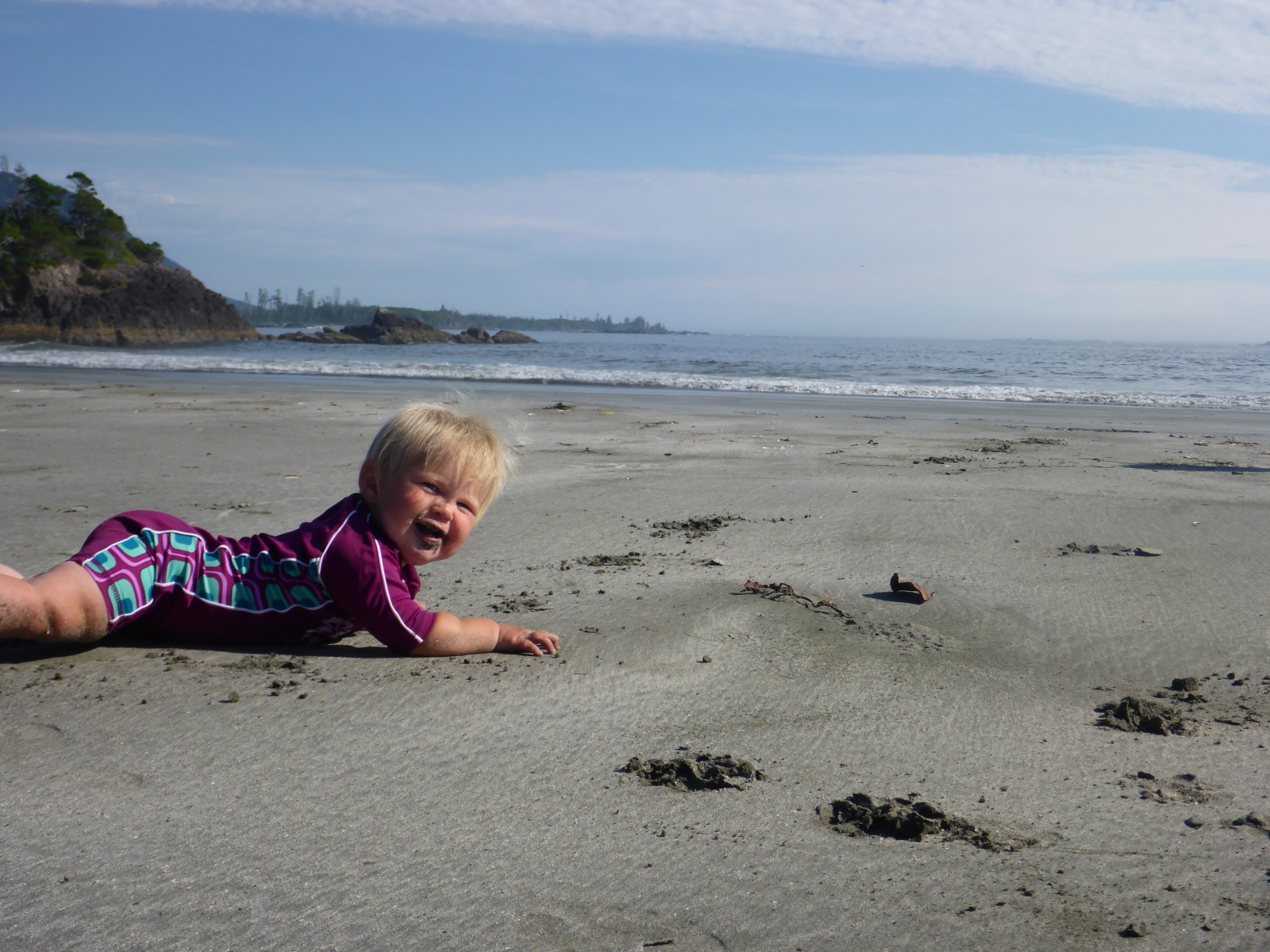 The Bunsby Islands, named after a Charles Dickens charactor, were also the site of the Sea Otter reintroduction project. BC Sea Otters had been hunted to extinction by the 1900s as women around the world desired their luxurious coats as fashionable items. In 1967 small populations of Alaskan Sea Otters were reintroduced to the area and ever so slowly they have been expanding their number and range. The Bunsby Island themselves offer endless possibilities for exploration by dinghy or kayak. We took Otto towards the outer ring of islands and were we tucked in safely on the protected shore and explored the tide pools and pocket beaches. Fynn splashed about happily in a giant pool that was warm as bathwater. At ten months old, Fynn has come into awareness among B.C. sea life. Upon seeing a beach, she eagerly flings herself towards it, ready to explore, digging up sand, seaweed and other beach bits. She has learned to stand on driftwood and walk along the forest floor. She is happier playing with pinecones and sticks than in a room full of toys. Could a girl ask for anything better?